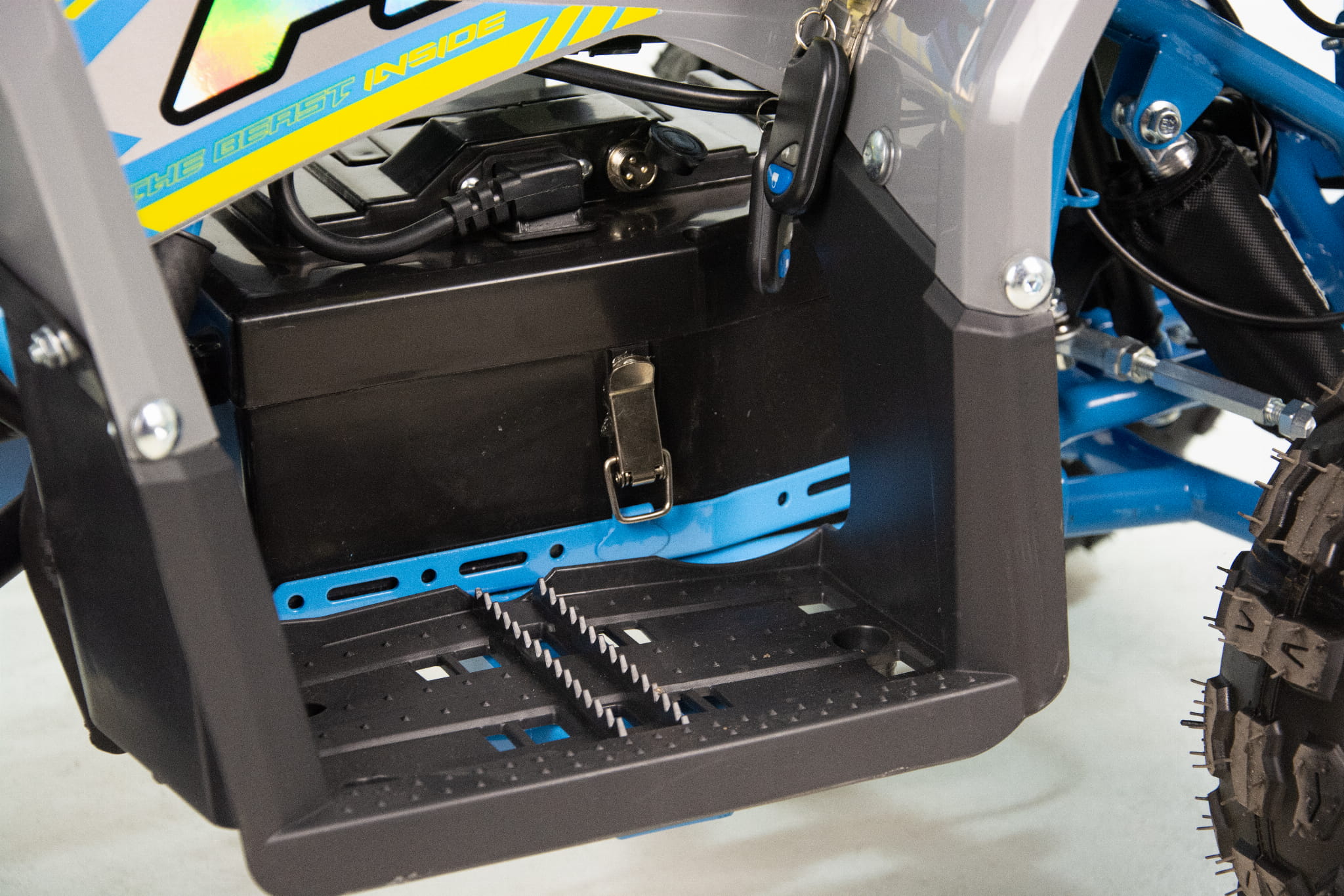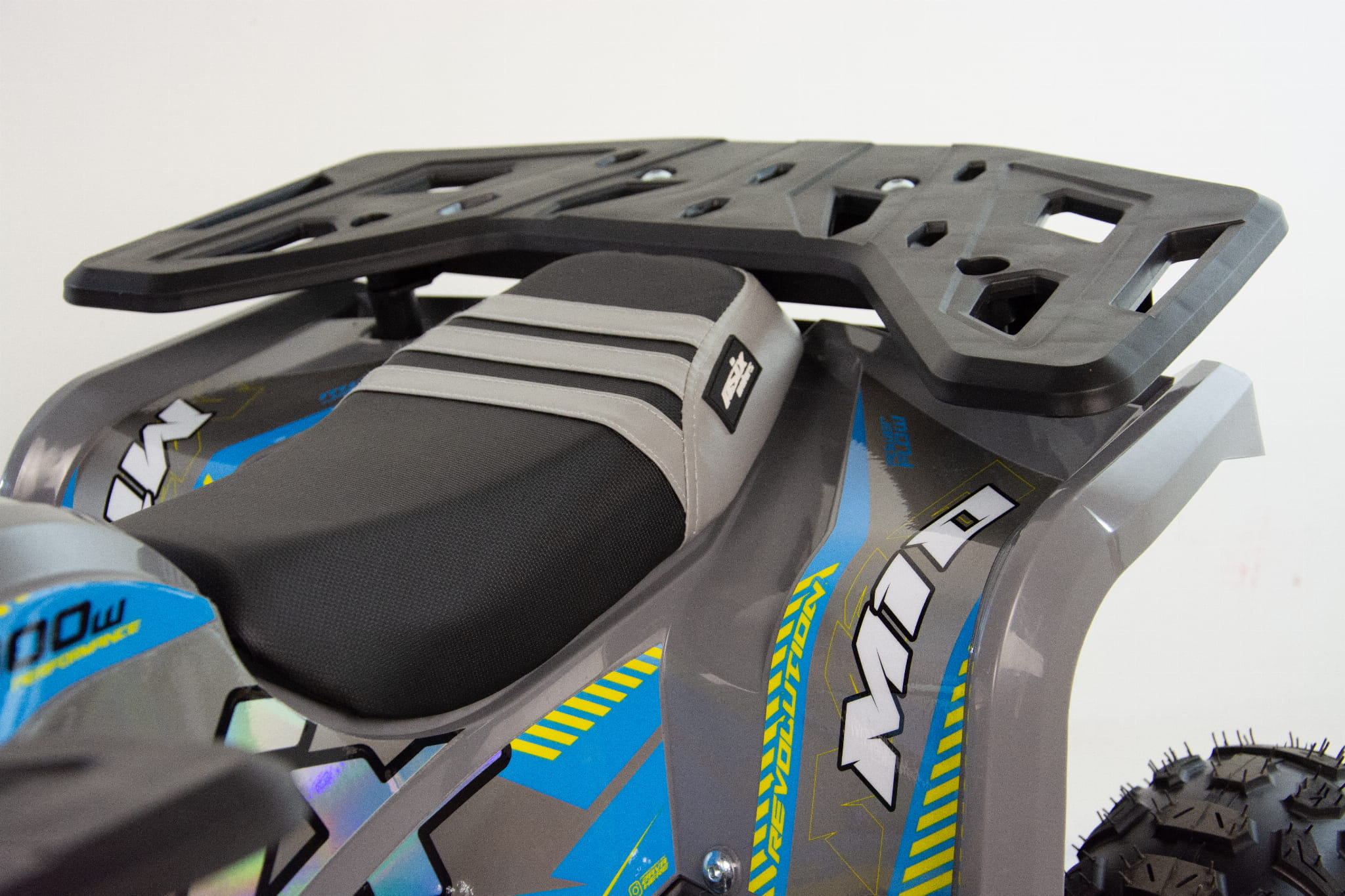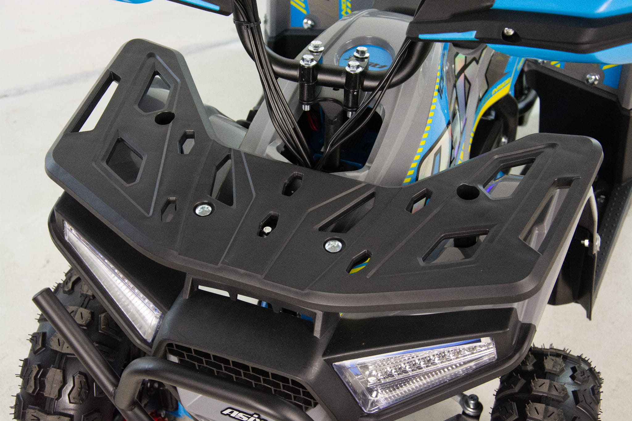 Przeprawowy model mini quada posiada 2 stalowe bagażniki platformowe umieszczone z przodu i z tyłu pojazdu. Bagażniki zaopatrzone są w dedykowane nakładki z tworzywa. Dzięki temu dzieci mają możliwość transportowania i przewożenia dodatkowego bagażu, a otwory w bagażnikach dają możliwość przymocowania ładunku