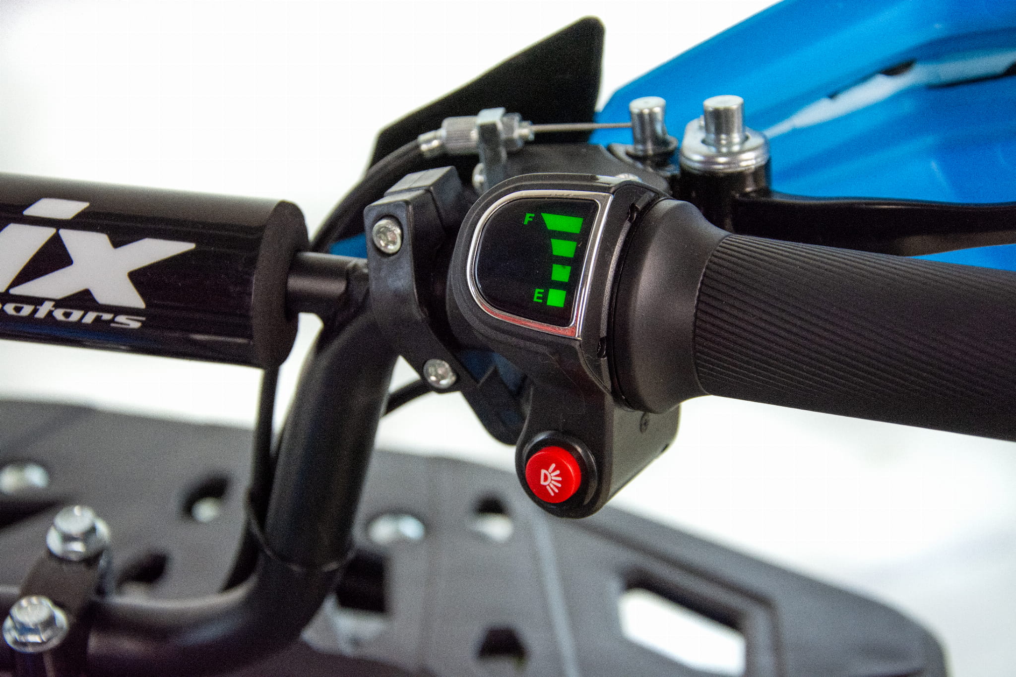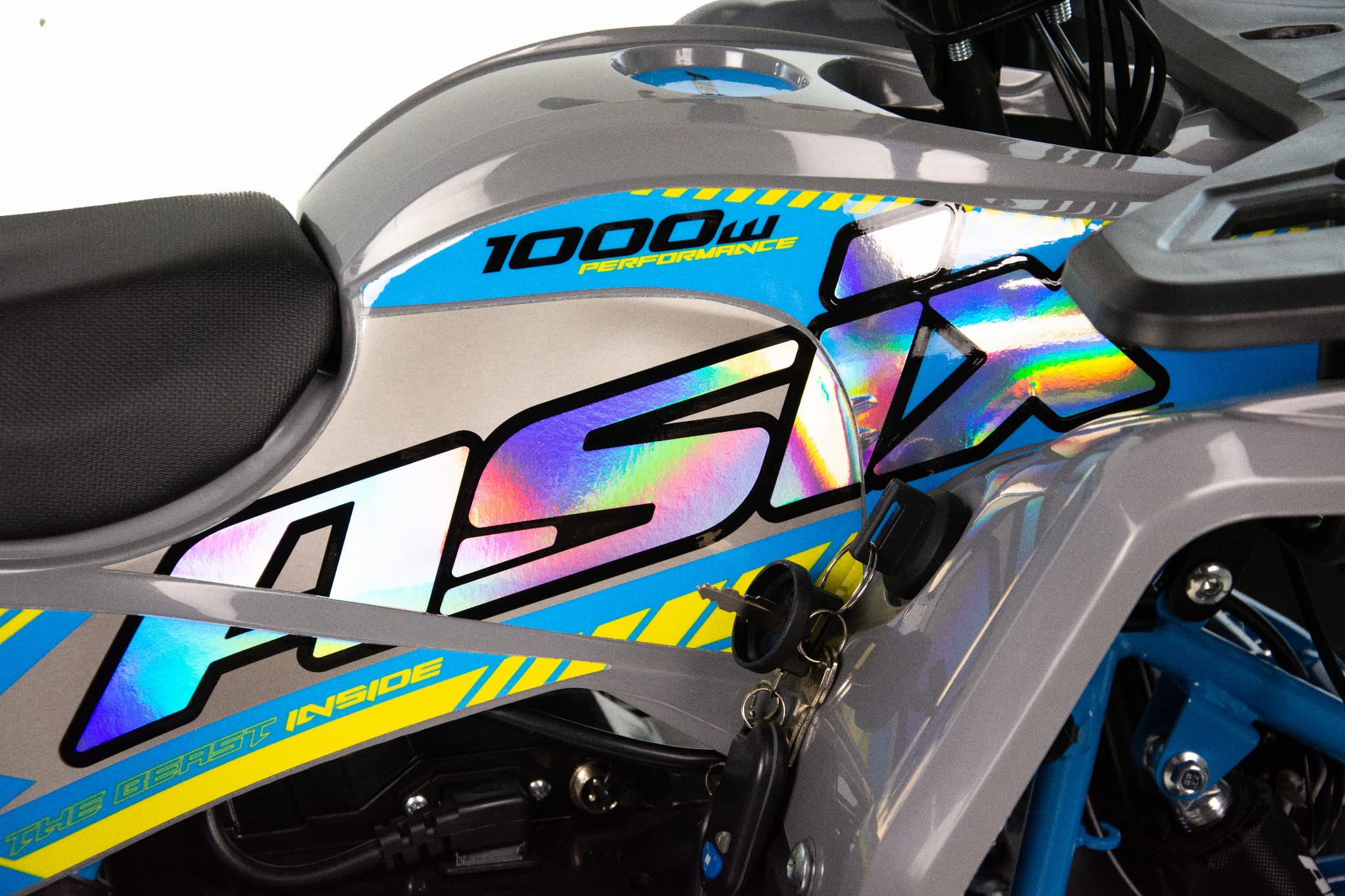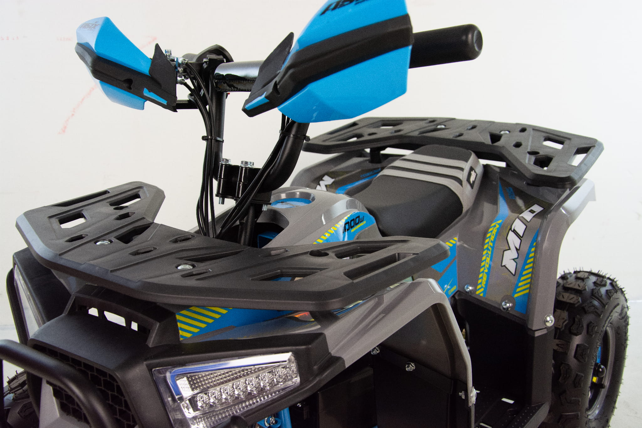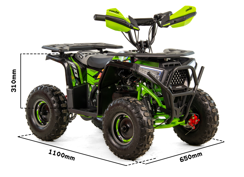 Mini quad ASIX E-M10 napędzany jest bezszczotkowym silnikiem elektryczny o mocy 1000W. Pojazd posiada 3-stopniową regulację prędkości ustawianą za pomocą stacyjki z kluczykiem. Przeprawowy quad z biegiem wstecznym dla dzieci w wieku 3-8 lat. Zestawiony jest na dużych 6" kołach, wyposażony w przednie oświetlenie LED, handbary, bagażniki przód i tył z dedykowanymi nakładkami oraz klakson