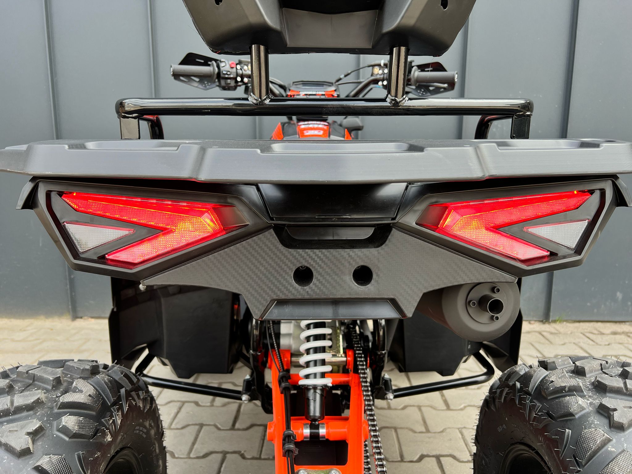 Przedni zderzak, bagażnik z przodu i z tyłu, aluminiowe felgi z markowymi oponami, hak , oparcie, przednie światła do jazdy dziennej w technologii LED.stalowy beadlock kalamitki na wahaczach handbary, wyciągaraka, naciąg łańcucha na mimośrodzie , szarpak, migacze,