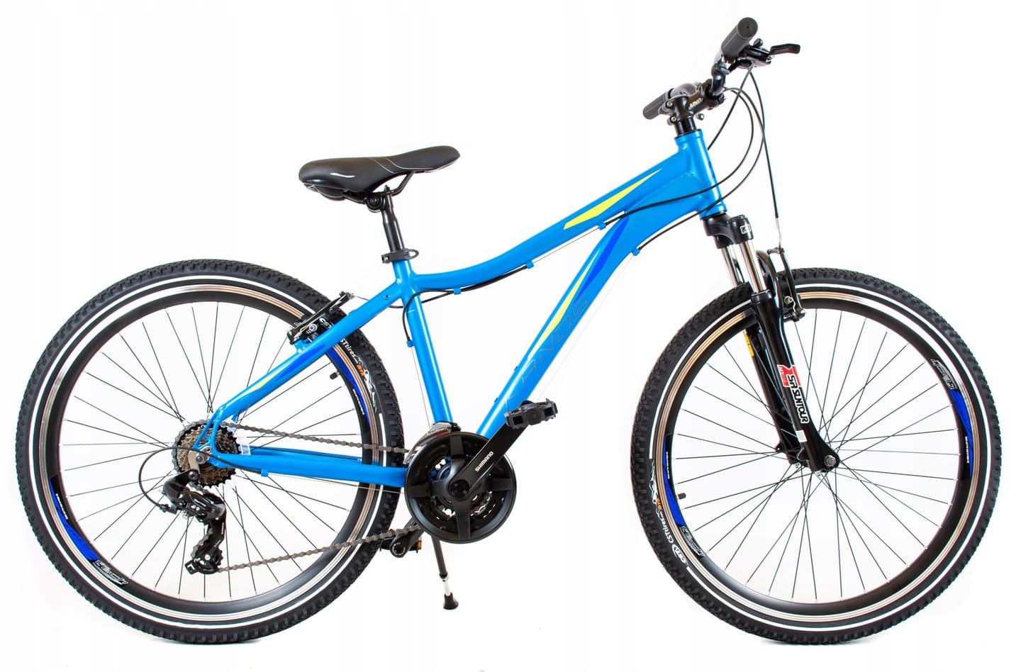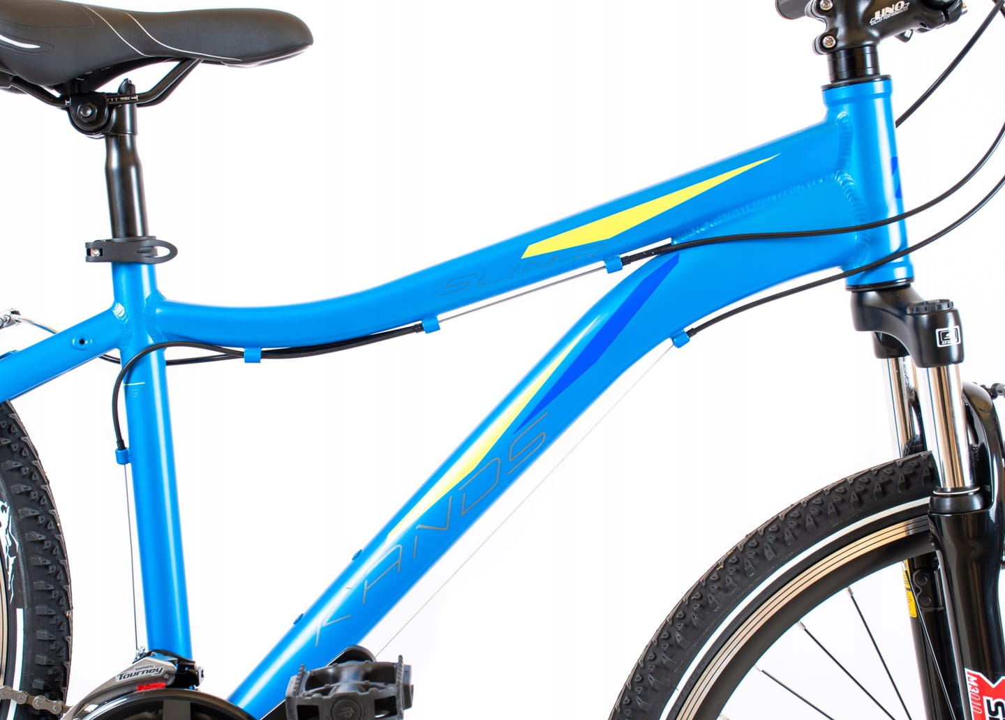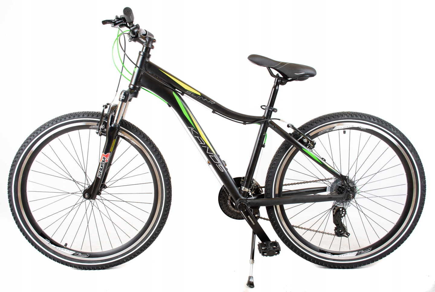 Rower górski KANDS SLIM-R zbudowany jest na 16” aluminiowej ramie. Wyposażony jest w amortyzowany widelec przedni SR Suntour o skoku 75 mm, przerzutki Shimano Tourney - 21 biegów, klamkomanetki Shimano z czytelnym wskazaniem przełożeń i 26” koła na aluminiowych dwukomorowych obręczach. Rower skierowany jest do młodych rowerzystów o wzroście 150-167 cm poszukujących wrażeń w rekreacyjnej i terenowej jeździe.