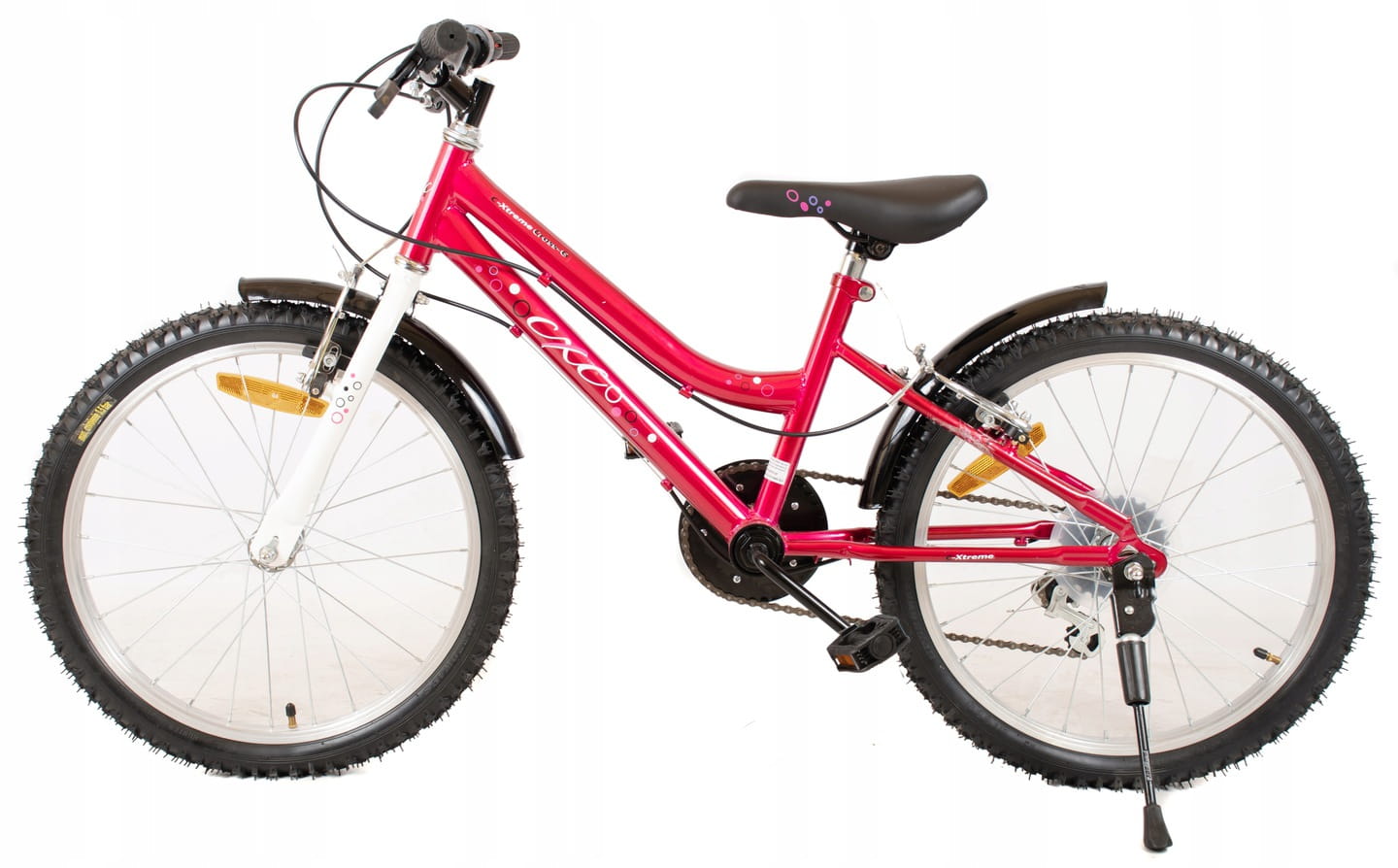 Rowerek dziecięcy CXC XTREME CROSS GIRL zbudowany jest na 12” stalowej obniżonej ramie. Wyposażony jest w 6 biegową przerzutkę Saiguan, manetkę typu gripshift ze wskazaniem przełożeń i 20” opony na aluminiowych obręczach. Rowerek skierowany jest do młodych rowerzystów w wieku 5-8 lat i wzroście 95-120 cm. Posiada także dodatkowe wyposażenie w postaci akcesoriów tj.: dzwonek, podpórka i odblaski zwiększające bezpieczeństwo rowerzysty.