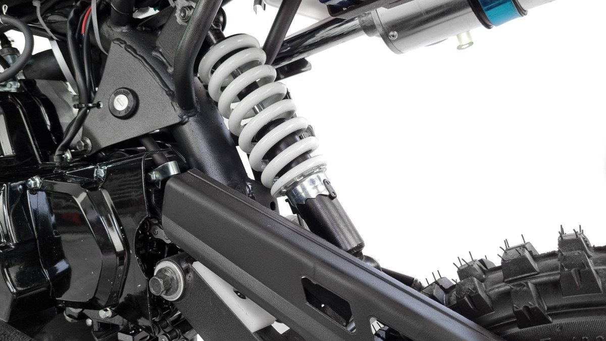 Z przodu mamy do dyspozycji dwa amortyzatory w standardowym układzie zapewniające optymalne tłumienie nierówności. Z tył jest jeden centralnie umieszczony amortyzator olejowy z regulacją twardości
