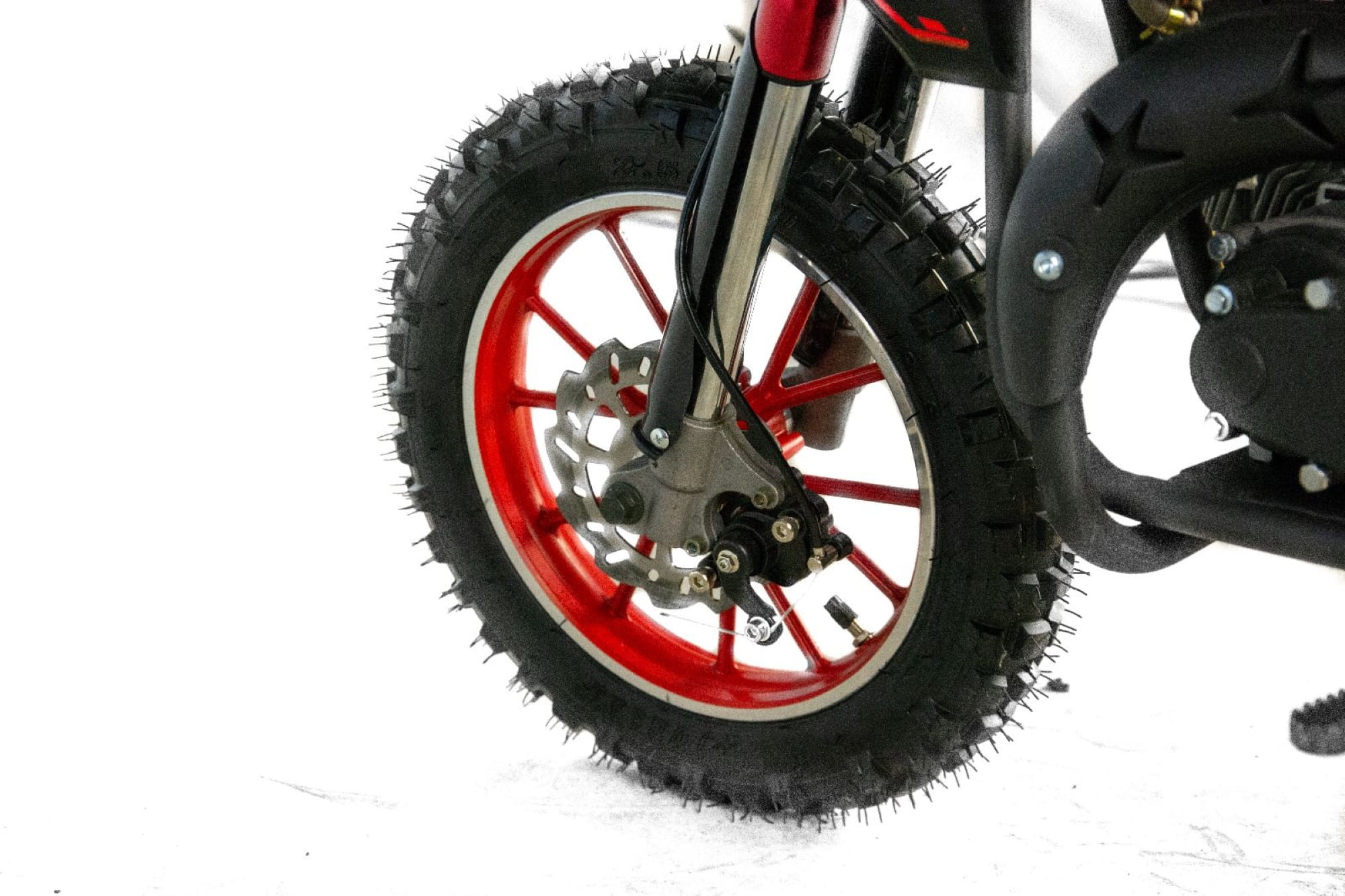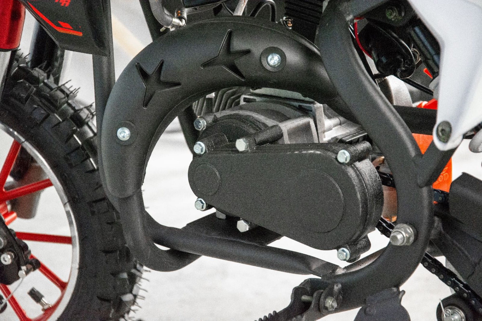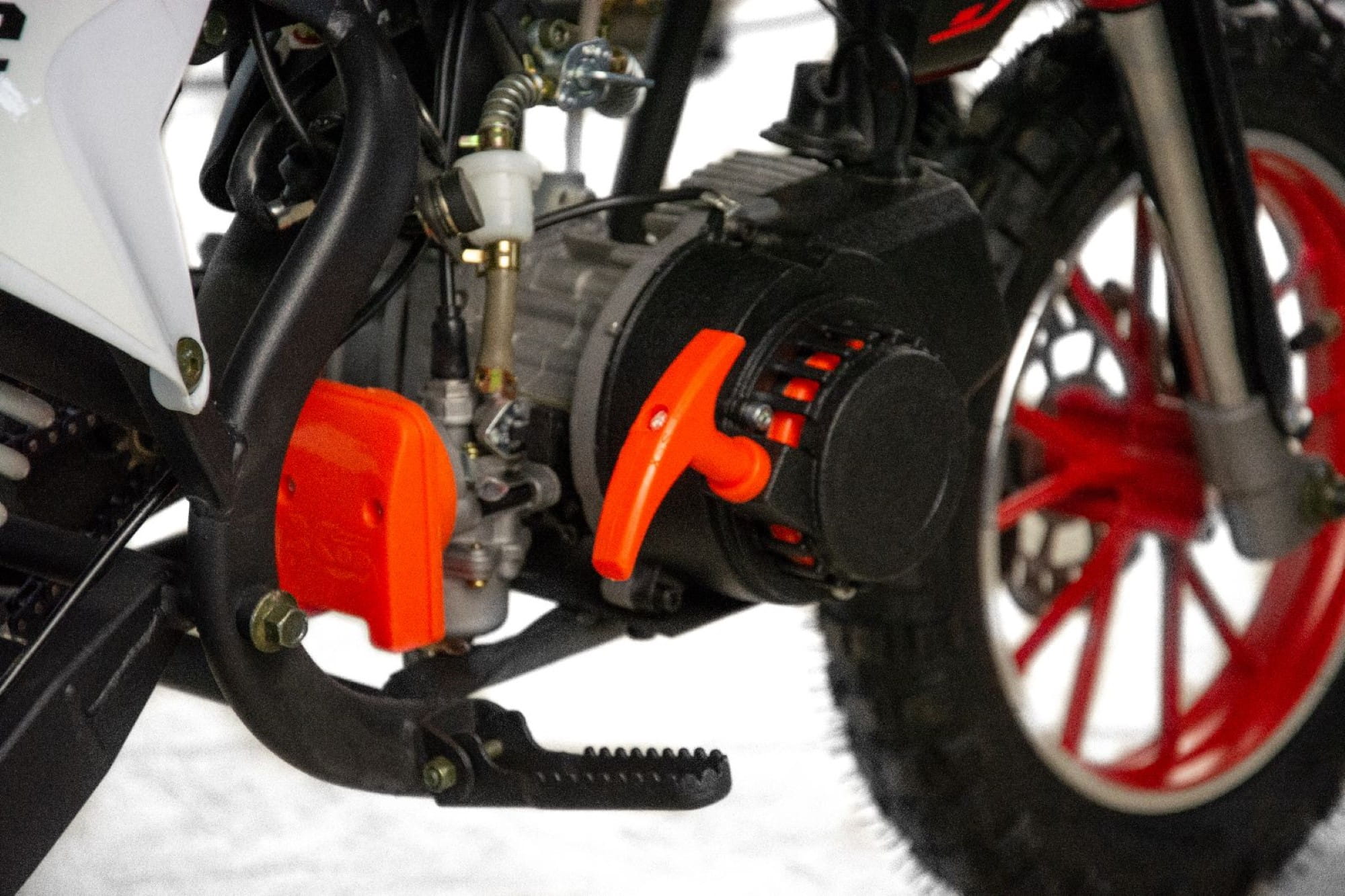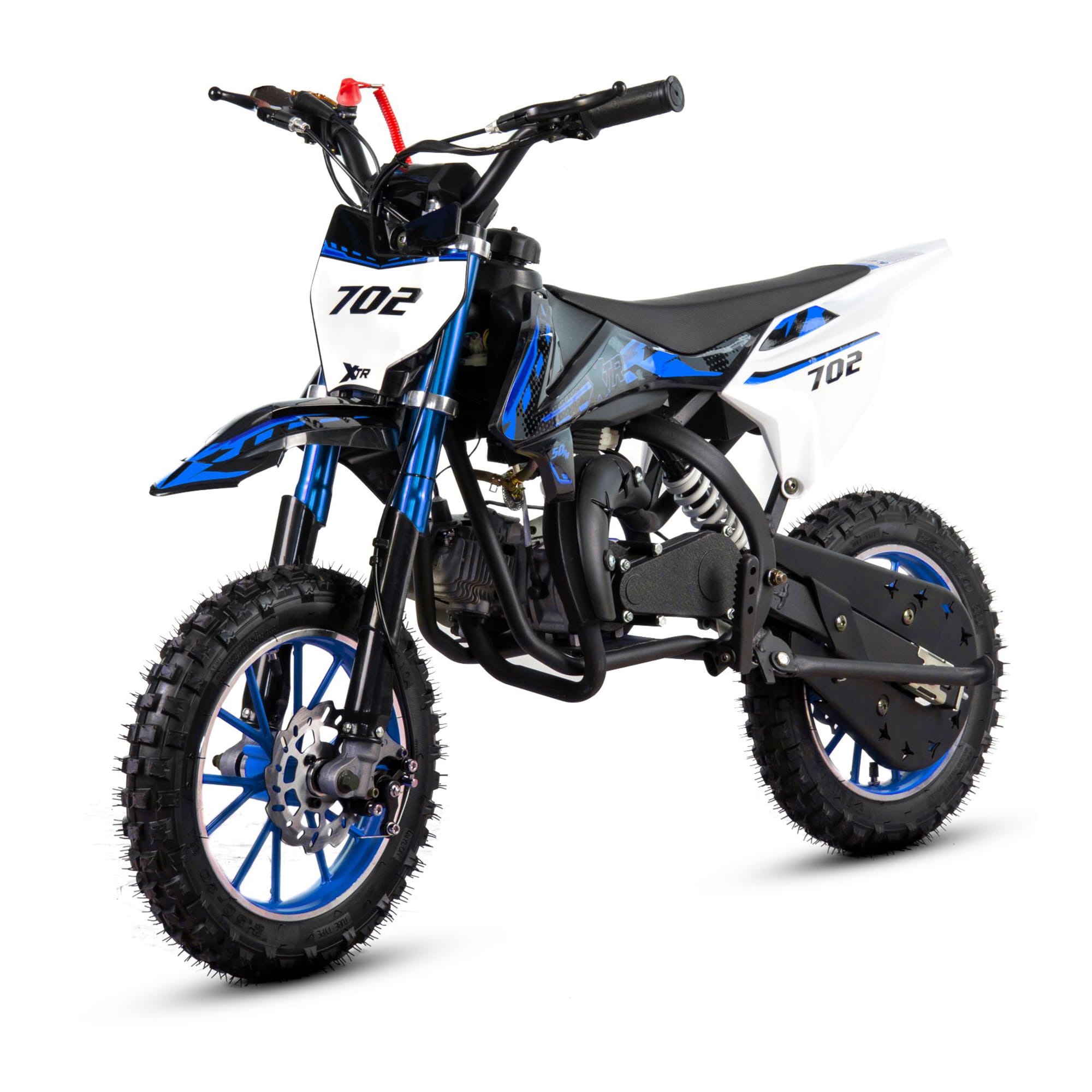Mini cross XTR 702 odpalany szarpakiem easy start to pojazd z silnikiem dwusuwowym (2T) o pojemności 49cm3 przeznaczony dla dzieci od 125cm wzrostu. Cross zestawiony na dużych 10" kołach wyposażony w hamulce tarczowe oraz regulację prędkości.